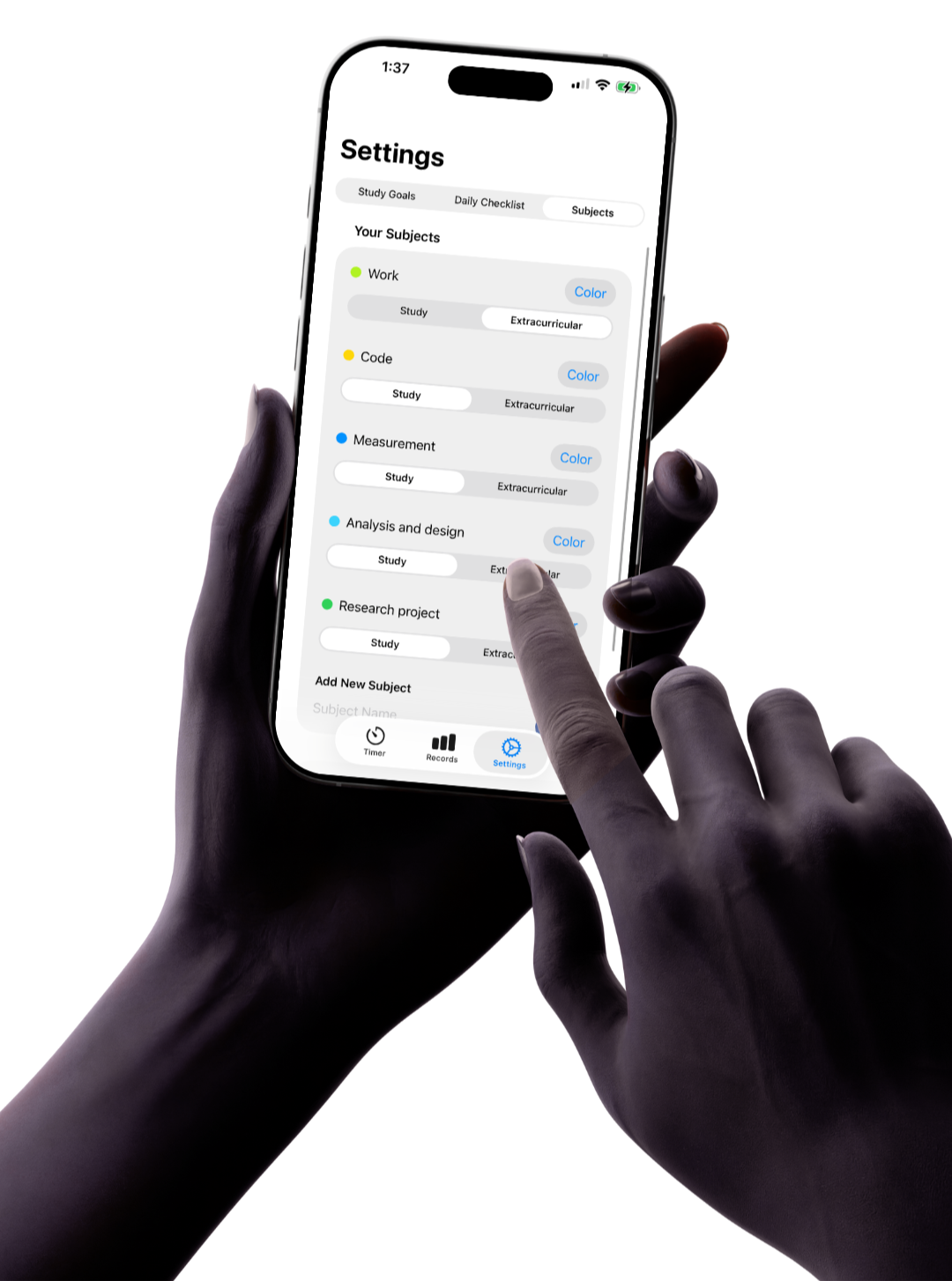 Simply add your subjects or projects in either Study or Extracirricular, and begin tracking hours completed for each.